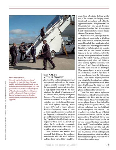 Air Force One and its military crew had been primed and ready on the tarmac, engines already roaring by the time the presidential motorcade traveling at high speed completed the 3.5 mile trip from the school. With the news of the terrorist attack, security was tighter than ever. The president was whisked onboard at the front of the plane. The rest of us were herded toward the rear stairs with agents shouting “Move it, move it!” which is clearly a Secret Service code meaning “Move it!” even as bomb squad personnel searched all our bags and equipment lest any danger had been planted in our gear. Even the CIA officer’s classified briefcase was inspected. When there is a threat anywhere, the Secret Service considers it might be diversionary action and the president might be the real target. Once onboard, the takeoff was unusually fast. What we did not know was that the pilot Col. Mark Tillman had just been warned there might be white house history quarterly