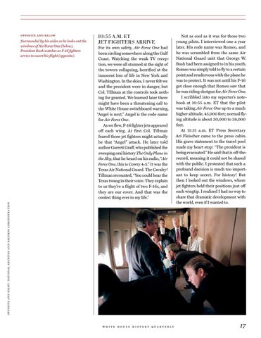 Not as cool as it was for those two young pilots. I interviewed one a year later. His code name was Romeo, and he was scrambled from the same Air National Guard unit that George W. Bush had been assigned to in his youth. Romeo was simply told to fly to a certain point and rendezvous with the plane he was to protect. It was not until his F-16 got close enough that Romeo saw that he was riding shotgun for Air Force One. I scribbled into my reporter’s notebook at 10:55 a.m. ET that the pilot was taking Air Force One up to a much higher altitude, 45,000 feet; normal flying altitude is about 30,000 to 38,000 feet. At 11:31 a.m. ET Press Secretary Ari Fleischer came to the press cabin. His grave statement to the travel pool made my heart stop: “The president is being evacuated.” He said that is off-therecord, meaning it could not be shared with the public. I protested that such a profound decision is much too important to keep secret. For history! But then I looked out the windows, where jet fighters held their positions just off each wingtip. I realized I had no way to share that dramatic development with the world, even if I wanted to.
