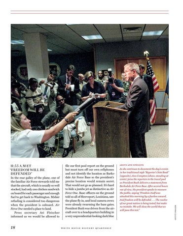 As she continues to document the day’s events in her traditional style “Reporter’s Note Book” (opposite), Ann Compton (above, standing at center) joins the reporters in the travel pool as President Bush delivers a statement from Barksdale Air Force Base. After several hours out of view, the president speaks to reassure the public, saying “Freedom itself was attacked this morning by a faceless coward. And freedom will be defended. . . . The resolve of our great nation is being tested, but make no mistake. We will show the world that we will pass this test.”