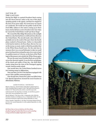 5:07 P.M. ET THE LAST LEG During the flight we spotted President Bush coming into the Secret Service cabin in the rear of the plane, speaking quietly to the agents, and then he stopped at the door of our press cabin. He waved away our reporters’ notebooks. He would save his public words for the Oval Office address to the nation coming up in three hours, but he did have a note of resolve in his voice when he warned the United States would “get those thugs.” We crossed the Blue Ridge Mountains as the sunlight faded on a day that had been so mild and clear all across the United States. The aircraft made a slow, full circle— probably not too far south of the spot where the fourth plane crashed in Pennsylvania—before we descended to the land at Andrews Air Force Base. Marine One was on the tarmac as usual, ready to whisk the president fast to the White House South Lawn. For the only time in memory, there was a second helicopter to take our small press travel pool down along the same river route to land in a golden sunset at 7:00 p.m. on the lawn of the Washington Monument, just outside the White House gates. We saw the same scene President Bush saw as he flew across the deserted capital. It was his first real glimpse of the shock and reality of that day—the thick black smoke rising from the ruins of the Pentagon’s gaping wound. America under attack. One month later, the United States bombed terrorists’ training camps in Afghanistan. One year later, Air Force One had been equipped with secure video satellite communications. One decade later, Osama bin Laden was killed when U.S. Special Operations stormed his secret location in Abbottabad, Pakistan.