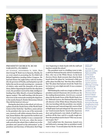 The morning of September 11, 2001, begins peacefully for President George W. Bush (above left) as he turns to answer a reporter’s question following a morning run in Sarasota. At 9:00 a.m., the president enters Classroom 301 at Emma E. Booker Elementary School (above right) moments before he learns from his chief of staff Andrew Card (opposite top) that America is under attack.