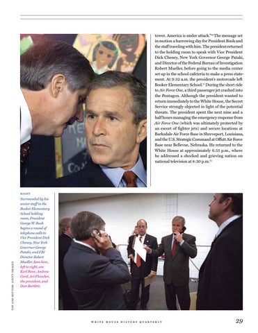 tower. America is under attack.”10 The message set in motion a harrowing day for President Bush and the staff traveling with him. The president returned to the holding room to speak with Vice President Dick Cheney, New York Governor George Pataki, and Director of the Federal Bureau of Investigation Robert Mueller, before going to the media center set up in the school cafeteria to make a press statement. At 9:32 a.m. the president’s motorcade left Booker Elementary School.11 During the short ride to Air Force One, a third passenger jet crashed into the Pentagon. Although the president wanted to return immediately to the White House, the Secret Service strongly objected in light of the potential threats. The president spent the next nine and a half hours managing the emergency response from Air Force One (which was ultimately protected by an escort of fighter jets) and secure locations at Barksdale Air Force Base in Shreveport, Louisiana, and the U.S. Strategic Command at Offutt Air Force Base near Bellevue, Nebraska. He returned to the White House at approximately 6:55 p.m., where he addressed a shocked and grieving nation on national television at 8:30 p.m.12