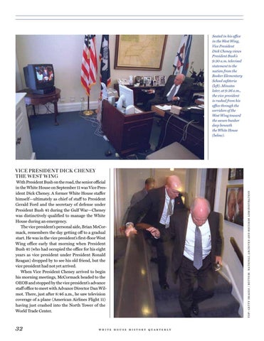 With President Bush on the road, the senior official in the White House on September 11 was Vice President Dick Cheney. A former White House staffer himself—ultimately as chief of staff to President Gerald Ford and the secretary of defense under President Bush 41 during the Gulf War—Cheney was distinctively qualified to manage the White House during an emergency. The vice president’s personal aide, Brian McCormack, remembers the day getting off to a gradual start. He was in the vice president’s first-floor West Wing office early that morning when President Bush 41 (who had occupied the office for his eight years as vice president under President Ronald Reagan) dropped by to see his old friend, but the vice president had not yet arrived. When Vice President Cheney arrived to begin his morning meetings, McCormack headed to the OEOB and stopped by the vice president’s advance staff office to meet with Advance Director Dan Wilmot. There, just after 8:46 a.m., he saw television coverage of a plane (American Airlines Flight 11) having just crashed into the North Tower of the World Trade Center.