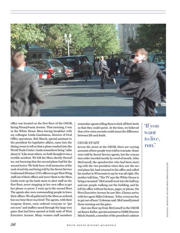 OEOB STAFF Across the street at the OEOB, there are varying accounts of how people were told to evacuate. Some were told by Secret Service agents, but the evacuation order traveled mostly by word of mouth. John McConnell, the speechwriter who had been meeting with the vice president when they saw the second plane hit, had returned to his office and called his mother in Wisconsin to say he was all right. His mother told him, “The TV says the White House is being evacuated.” McConnell went into the hallway and saw people walking out the building, and he left his office without his keys, pager, or phone. On West Executive Avenue he saw Mrs. Cheney arrive with her agent Mike Coleman. “John, everyone has to get out of here,” Coleman said. McConnell joined those running out the gates. Just one floor up from McConnell in the OEOB sat Karen Keller, special assistant to OMB Director Mitch Daniels, a member of the president’s cabinet
