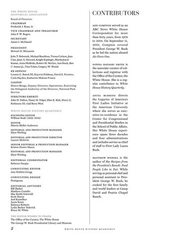 ann compton served as an ABC News White House Correspondent for more than forty years, from 1974 to 2014. On September 11, 2001, Compton covered President George W. Bush as he led the nation aboard Air Force One. donna hayashi smith is the associate curator of collections and registrar with the Office of the Curator, the White House. She is a regular contributor to White House History Quarterly. anita m c bride directs the Legacies of Americaâs First Ladies Initiative at the American University where she serves as executive-in-residence in the Center for Congressional and Presidential Studies in the School of Public Affairs. Her White House experience spans three decades and four administrations and includes service as chief of staff to First Lady Laura Bush. matthew wendel is the author of the Recipes from the Presidentâs Ranch: Food People Like to Eat. While serving as personal chef and personal assistant to President George W. Bush, he cooked for the first family and world leaders at Camp David and Prairie Chapel Ranch.