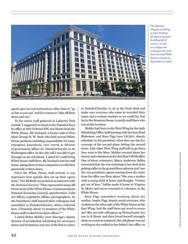 agents gave no real instructions other than to “go as fast as you can” and for women to “take off their shoes and run.” To the senior staff gathered in Lafayette Park outside, I suggested we head to the DaimlerChrysler office at 1401 H Street NW, two blocks from the White House. My husband, a former aide to President George H. W. Bush who held several White House positions including responsibility for many emergency procedures, now served as director of government affairs for DaimlerChrysler in its Washington office. In the only call I was able to get through on my cell phone, I asked if I could bring White House staff there. My husband sent his staff home, asking them to leave computers on with their passwords written down. “Once the White House staff arrived, it was impressive how quickly they set up their operations,” Tim McBride recounted in an interview with the National Journal. “They represented many different areas of the White House, Communications, National Economic Council, speechwriters, Cabinet Affairs, Legislative Affairs, photographers. As the President’s staff learned their colleagues had assembled at DaimlerChrysler, others collected here. Ultimately about 72 members of the White House staff worked from these offices.”35 I asked Helen Mobley (now Sauvage), deputy director of presidential scheduling for correspondence and invitations and one of the first to arrive