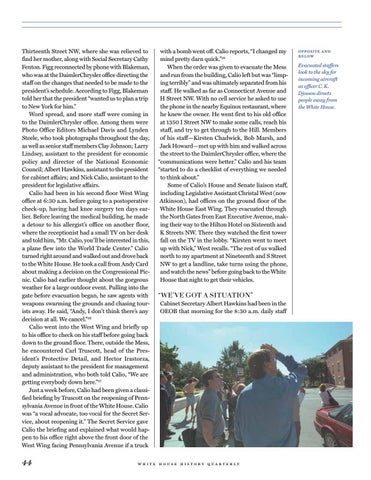with a bomb went off. Calio reports, “I changed my mind pretty darn quick.”38 When the order was given to evacuate the Mess and run from the building, Calio left but was “limping terribly” and was ultimately separated from his staff. He walked as far as Connecticut Avenue and H Street NW. With no cell service he asked to use the phone in the nearby Equinox restaurant, where he knew the owner. He went first to his old office at 1350 I Street NW to make some calls, reach his staff, and try to get through to the Hill. Members of his staff—Kirsten Chadwick, Bob Marsh, and Jack Howard—met up with him and walked across the street to the DaimlerChrysler office, where the “communications were better.” Calio and his team “started to do a checklist of everything we needed to think about.” Some of Calio’s House and Senate liaison staff, including Legislative Assistant Christal West (now Atkinson), had offices on the ground floor of the White House East Wing. They evacuated through the North Gates from East Executive Avenue, making their way to the Hilton Hotel on Sixteenth and K Streets NW. There they watched the first tower fall on the TV in the lobby. “Kirsten went to meet up with Nick,” West recalls. “The rest of us walked north to my apartment at Nineteenth and S Street NW to get a landline, take turns using the phone, and watch the news” before going back to the White House that night to get their vehicles.