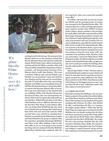 meeting he held with his team. His assistant Cindy Mendel called over to the meeting to inform him that the Situation Room had reported a plane hitting the World Trade Center. Albert continued the meeting and had Ali Tulbah, a member of his staff whose portfolio included the Department of Transportation, call Transportation Secretary Norm Mineta’s chief of staff, John Flaherty. “We’ve got a situation,” Flaherty said, and told Tulbah to get Hawkins “on a secure phone” to give more information. Hawkins and his team saw the second plane hit on the TV in the office where they were meeting. Hawkins and Tulbah went immediately from the OEOB to the Situation Room to ask the duty officer to connect with Secretary Mineta’s office on secure line to get more information on the situation that was unfolding. While at the Situation Room door that faces the Mess, they were interrupted by the shouts of Secret Service agents directing staff to go into the Mess. Tulbah followed others to the Mess, while Hawkins went in a different direction up to the first floor West Wing “to Josh Bolten’s office who was Acting Chief of Staff that day since Andy was in Florida and was sharing what I had learned from DOT with Josh and Condi until the USSS escorted them away and left me standing there.” Hawkins evacuated from the White House complex and found himself in the group in Lafayette Park. He remembers “gratefully follow[ing] [McBride] and others to the office building. I had no idea what office it was we were going to, but remember being told your husband [Timothy McBride] officed there.” Hawkins later explained, “After the