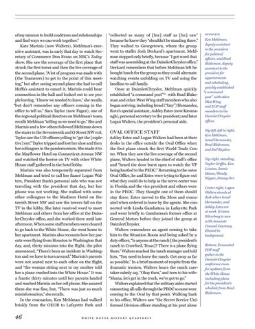 “collected as many of [his] staff as [he] saw” because he knew they “shouldn’t be standing there.” They walked to Georgetown, where the group went to staffer Josh Deckard’s apartment. Mehlman stopped only briefly, because “I got word that staff was assembling at the DaimlerChrysler office.” Deckard remembers that before Mehlman left he bought lunch for the group so they could alternate watching events unfolding on TV and using the landline to call family. Once at DaimlerChrysler, Mehlman quickly established “a command post”41 with Brad Blakeman and other West Wing staff members who also began arriving, including Israel (“Izzy”) Hernandez, Rove’s special assistant; Ashley Estes (now Kavanaugh), personal secretary to the president; and later Logan Walters, the president’s personal aide.