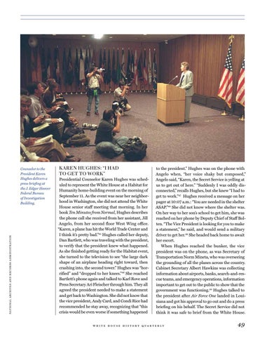 KAREN HUGHES: “I HAD TO GET TO WORK” Presidential Counselor Karen Hughes was scheduled to represent the White House at a Habitat for Humanity home-building event on the morning of September 11. As the event was near her neighborhood in Washington, she did not attend the White House senior staff meeting that morning. In her book Ten Minutes from Normal, Hughes describes the phone call she received from her assistant, Jill Angelo, from her second floor West Wing office. “Karen, a plane has hit the World Trade Center and I think it’s pretty bad.”45 Hughes called her deputy, Dan Bartlett, who was traveling with the president, to verify that the president knew what happened. As she finished getting ready for the Habitat event, she turned to the television to see “the large dark shape of an airplane heading right toward, then crashing into, the second tower.” Hughes was “horrified” and “dropped to her knees.”46 She reached Bartlett’s phone again and talked to Karl Rove and Press Secretary Ari Fleischer through him. They all agreed the president needed to make a statement and get back to Washington. She did not know that the vice president, Andy Card, and Condi Rice had recommended he stay away, recognizing that “this crisis would be even worse if something happened