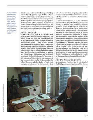 info to the speechwriters, comparing notes on ‘what we were hearing’ and filter information to Karen [Hughes] for her to understand the tone in the country.” Stanzel also happened to be the scheduled communications duty officer that day, tasked with covering for the press office and fielding reporters’ questions. When West Wing staff went back to the White House around 4:30 p.m., Stanzel made his way home. Then he received a call from Press Secretary Ari Fleischer asking him to go back to the White House to “man the phones” as “people will expect we are there working.” Stanzel’s roommate and press office staffer Allen Abney offered to drive Stanzel, and they made their way through the extended security perimeter, reaching the White House around 6:00 p.m. Stanzel fielded calls outside of Fleischer’s office until 6:30 a.m. the next morning, when the next duty officer came on—a full twenty-four hours on the job. Stanzel emphasizes how he never wavered on his commitment to the role: “our jobs as we predicted what they would be like changed immediately and dramatically.”