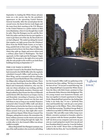 her the Counsel’s Office staff was gathering at the downtown law firm, adding, “We have to research the laws of war.” “It was just so mind-blowing,” she says. Riepenhoff had evacuated the White House from the Mess with Britt Grant, assistant to Deputy Domestic Policy Director John Bridgeland. The two young women were hometown friends, and they ran together to Grant’s apartment in Dupont Circle. Riepenhoff had started her day feeling that “today is my lucky day.” It was a “perfectly blue, clear and beautiful day,” and she got a rare prime parking spot on the Ellipse. Then, when sitting at her desk that morning, “President George Bush 41 walked in to say hello to [White House Counsel] Al Gonzales.” She and office mate Libby Camp (now Elliott), executive assistant to Gonzales, asked to take a picture with the former president. Riepenhoff “sat down at my computer and wrote my parents an e-mail saying how much I love my job and how President Bush 41 came by; I was the luckiest person in the world.” Hours later, as Riepenhoff walked to the law firm, she “was terrified the entire