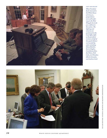 When President Bush returned to the White House at 6:55 p.m., preparations were well under way in the West Wing for his 8:30 p.m. address to the nation. The lighting and cameras are positioned in the Oval Office (left) as the president reviews a draft of the speech (below) surrounded by aides including Mary Matalin, Karen Hughes, Condoleezza Rice, Karl Rove, Nick Calio, Ari Fleischer, Alberto Gonzales, and Andrew Card.