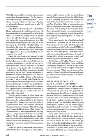 SEPTEMBER 12, 2001: “WE HAVE A LOT OF WORK TO DO” Johnson directed his staff to come back to work on September 12. “I went to the OEOB the next day to connect with my team. They were quiet and concerned but showed confidence to stay focused on business.” Eric Motley on Johnson’s staff recounted, “Clay came over, and in a very calming way talked about what we had experienced, how sad and devastating it was.” “He also talked about the president’s speech,” and said, “We are here to support the president, and we have a lot of work to do.” “We felt ennobled and emboldened,” remembers Motley. “It was patriotically riveting.” Karen Keller returned to the White House on September 12 after OMB Director Daniels had called her the night before at 9:00 or 10:00 p.m. and said he needed her back. “It was surreal getting to work and seeing big, huge military vehicles all around the White House. I was scared but I knew I had to go back and I wanted to be there,” she recalled. The thirty-year veteran staff member