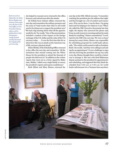 she helped to evacuate never returned to the office, however, and retired soon after the attacks. Ali Tulbah from Cabinet Affairs returned the next day and remembers the military presence and the sense of “total resolve that what we all would need to be doing was to support the president now.” “We had a big meeting about what all the agencies needed to do,” he recalls. “One of the presentations included a readout of the impact on the foreign exchange of the U.S. dollar and the value of the U.S. currency today. . . . It was the first time this hit us about how this was an attack on the American way of life, not just a physical attack.” Helen Mobley of the Scheduling Office returned to her office the next day and remembers “all the invitations that started coming into the White House for the president to attend the funerals of people who died on 9/11.” In addition to the written regrets that went out in a letter signed by Blakeman, Mobley “called every single family to convey the president’s regrets and express condolences.” Ruth Elliott and Mary Haines returned the
