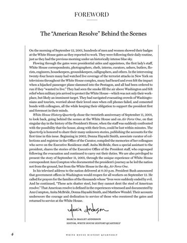 FOREWORD The “American Resolve” Behind the Scenes On the morning of September 12, 2001, hundreds of men and women showed their badges at the White House gates as they reported to work. They were following their daily routine, just as they had the previous morning under an historically intense blue sky. Flowing through the gates were presidential aides and appointees, the first lady’s staff, White House correspondents, photographers, chefs, interns, curators, ushers, butlers, florists, engineers, housekeepers, groundskeepers, calligraphers, and others. In the intervening twenty-four hours many had watched live coverage of the terrorist attacks in New York on televisions throughout the White House complex, many had heard and even felt the impact when a hijacked passenger plane slammed into the Pentagon, and all had been ordered to run if they “wanted to live.” They had seen the smoke fill the air above Washington and felt relief when military jets arrived to protect the White House—which was not only their workplace, but likely an imminent target. They had navigated evacuating crowds of Washingtonians and tourists, worried about their loved ones when cell phones failed, and cemented bonds with colleagues, all the while keeping their obligation to support the president first and foremost in their minds. White House History Quarterly chose the twentieth anniversary of September 11, 2001, to look back, going behind the scenes at the White House and on Air Force One, on that singular day in the history of the President’s House, when the staff was suddenly confronted with the possibility that the house, along with their lives, could be lost within minutes. The Quarterly is honored to share their many unknown stories, publishing the accounts for the first time in this issue. Beginning in 2002, Donna Hayashi Smith, associate curator of collections and registrar in the Office of the Curator, compiled the memories of her colleagues who serve on the Executive Residence staff. Anita McBride, then a special assistant to the president, shares the stories of the Executive Office of the President staff, who regrouped following the evacuation and continued to carry out their duties. We are also privileged to present the story of September 11, 2001, through the unique experience of White House correspondent Ann Compton who documented the president’s journey as he led the nation not from the ground, but from the White House in the sky, Air Force One. In his televised address to the nation delivered at 8:30 p.m. President Bush announced that government offices in Washington would reopen for all workers on September 12. He called for prayers for the families of the thousands whose “lives were suddenly ended by evil. And he continued, “These acts shatter steel, but they cannot dent the steel of American resolve.” That American resolve is defined in the experiences witnessed and documented by Ann Compton, Anita McBride, Donna Hayashi Smith, and Matthew Wendel. Their accounts underscore the courage and dedication to service of those who reentered the gates and returned to service at the White House.