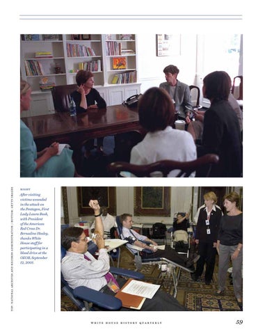 After visiting victims wounded in the attack on the Pentagon, First Lady Laura Bush, with President of the American Red Cross Dr. Bernadine Healey, thanks White House staff for participating in a blood drive at the OEOB, September 12, 2001.