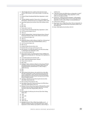 medium.com. 52. “What Was It Like in the White House on September 11, 2001?” interview with Nicolle Wallace, Today, September 11, 2016, online at www.today.com/video. 53. Jimmy Orr, “ ‘A Plane Just Hit the Pentagon!’: A Wyomingite’s Memories from the White House on 9/11,” Cowboy State Daily, September 11, 2020, online at https://cowboystatedaily.com. 54. “Voices of 9-11,” 2490–91. 55. Page Austin, “9/11: A White House Story,” Harvest, September 10, 2015, online at Harvest Homeowners Association website, www. harvesthoa.com. 56. Laura Bush, Spoken from the Heart, 206–07.