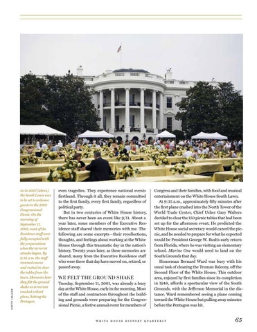 Congress and their families, with food and musical entertainment on the White House South Lawn. At 9:35 a.m., approximately fifty minutes after the first plane crashed into the North Tower of the World Trade Center, Chief Usher Gary Walters decided to clear the 150 picnic tables that had been set up for the afternoon event. He predicted the White House social secretary would cancel the picnic, and he needed to prepare for what he expected would be President George W. Bush’s early return from Florida, where he was visiting an elementary school. Marine One would need to land on the South Grounds that day. Houseman Bernard Ward was busy with his usual task of cleaning the Truman Balcony, off the Second Floor of the White House. This outdoor area, enjoyed by first families since its completion in 1948, affords a spectacular view of the South Grounds, with the Jefferson Memorial in the distance. Ward remembered seeing a plane coming toward the White House but pulling away minutes before the Pentagon was hit.