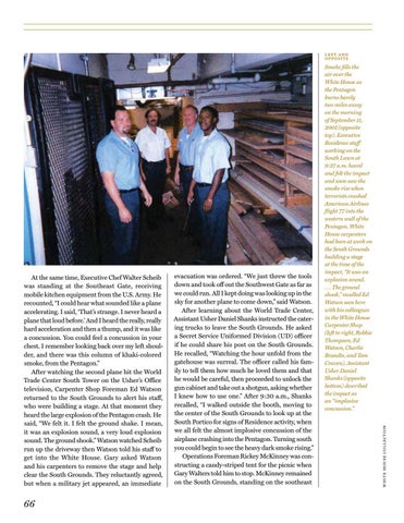 evacuation was ordered. “We just threw the tools down and took off out the Southwest Gate as far as we could run. All I kept doing was looking up in the sky for another plane to come down,” said Watson. After learning about the World Trade Center, Assistant Usher Daniel Shanks instructed the catering trucks to leave the South Grounds. He asked a Secret Service Uniformed Division (UD) officer if he could share his post on the South Grounds. He recalled, “Watching the hour unfold from the gatehouse was surreal. The officer called his family to tell them how much he loved them and that he would be careful, then proceeded to unlock the gun cabinet and take out a shotgun, asking whether I knew how to use one.” After 9:30 a.m., Shanks recalled, “I walked outside the booth, moving to the center of the South Grounds to look up at the South Portico for signs of Residence activity, when we all felt the almost implosive concussion of the airplane crashing into the Pentagon. Turning south you could begin to see the heavy dark smoke rising.” Operations Foreman Rickey McKinney was constructing a candy-striped tent for the picnic when Gary Walters told him to stop. McKinney remained on the South Grounds, standing on the southeast