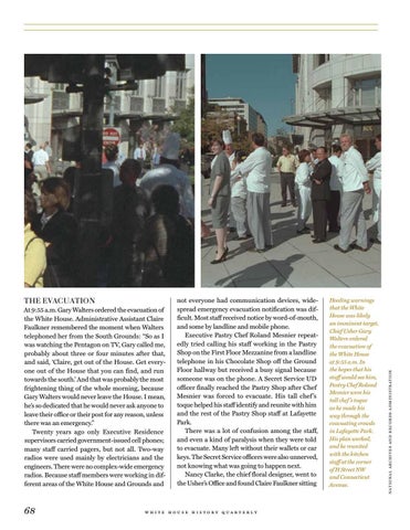 not everyone had communication devices, widespread emergency evacuation notification was difficult. Most staff received notice by word-of-mouth, and some by landline and mobile phone. Executive Pastry Chef Roland Mesnier repeatedly tried calling his staff working in the Pastry Shop on the First Floor Mezzanine from a landline telephone in his Chocolate Shop off the Ground Floor hallway but received a busy signal because someone was on the phone. A Secret Service UD officer finally reached the Pastry Shop after Chef Mesnier was forced to evacuate. His tall chef ’s toque helped his staff identify and reunite with him and the rest of the Pastry Shop staff at Lafayette Park. There was a lot of confusion among the staff, and even a kind of paralysis when they were told to evacuate. Many left without their wallets or car keys. The Secret Service officers were also unnerved, not knowing what was going to happen next. Nancy Clarke, the chief floral designer, went to the Usher’s Office and found Claire Faulkner sitting
