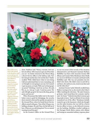 alone. Faulkner said, “Nancy, evacuate. Just run. Get out of here. Tell everyone to get out of here that you see.” As Clarke returned to the Flower Shop, a Secret Service officer in the hallway said, “Go! Go! Just get out the door. Get out the door.” Clarke recalled, “Well, I didn’t know what we were doing. I did not understand that we were evacuating, and so I thought we were going to our cars. So I wanted to get my purse, so I said, ‘Well, can I at least go get my purse?’ thinking, I need my car keys. He said, ‘Oh, no, no. Just go.’ I said, ‘I need my purse.’ He said, ‘All right, go get it.’ So I ran in the shop, got my purse, and ran out.” When Houseman Ben Kelly went to the men’s locker room to grab his belongings, the security doors started to shut and he quickly ran upstairs to the Ground Floor, where he found Secret Service officers armed with guns. “One of the UD guys was holding a shotgun. He said, ‘Run. Get the hell out of here. What are you still doing here?’ So we started running toward the gate.” In the Curator’s Office on the Ground Floor,