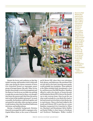 and K Streets NW, where there were televisions, food, phones, and bathrooms. She purchased Tylenol and Advil at the hotel, knowing many people would probably have headaches. Those gathered at the Hilton included chefs, housekeepers, a butler, and Storeroom Chief Bill Hamilton. Hamilton offered to walk to his church, at Twenty-Seventh and Dumbarton Streets NW, to borrow his church’s van to take everyone home. Once he got the van, what would normally be a ten-block drive back to the hotel turned out to be thirty to forty blocks, due to road closures. Those at the hotel walked to Sixteenth and R Streets NW to meet him at a corner. Hamilton transported Cris Comerford to Wheaton, Maryland, and Housekeeper Sylvia DaSilva and Rachel Walker to their homes in Northeast and Northwest Washington. Walker recalled