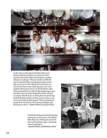 In the end, we all recognized the fact that we’ve always all had a target on our chest here that anyone who works within the Residence confines always is in danger. This just made it a little bit more immediate that somebody actually tried to take action on it. But I think each and every one of us knows that every single day you come, and anytime that you’re near or in the Residence, that there’s potential for terrible things happening to you, but that’s just one of the things that makes this job so unique. But the honor and the pleasure of serving the first family and the country, I mean, that, to me, we’re not unique in that respect. There are plenty of people that would do it. We’re just privileged to get the chance to do it.—Walter Scheib, Executive Chef