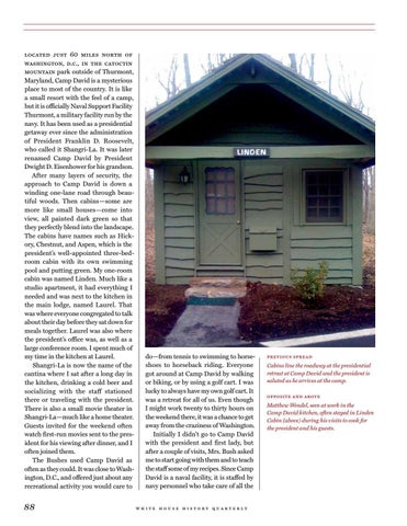 located just 60 miles north of washington, d.c., in the catoctin mountain park outside of Thurmont, Maryland, Camp David is a mysterious place to most of the country. It is like a small resort with the feel of a camp, but it is officially Naval Support Facility Thurmont, a military facility run by the navy. It has been used as a presidential getaway ever since the administration of President Franklin D. Roosevelt, who called it Shangri-La. It was later renamed Camp David by President Dwight D. Eisenhower for his grandson. After many layers of security, the approach to Camp David is down a winding one-lane road through beautiful woods. Then cabins—some are more like small houses—come into view, all painted dark green so that they perfectly blend into the landscape. The cabins have names such as Hickory, Chestnut, and Aspen, which is the president’s well-appointed three-bedroom cabin with its own swimming pool and putting green. My one-room cabin was named Linden. Much like a studio apartment, it had everything I needed and was next to the kitchen in the main lodge, named Laurel. That was where everyone congregated to talk about their day before they sat down for meals together. Laurel was also where the president’s office was, as well as a large conference room. I spent much of my time in the kitchen at Laurel. Shangri-La is now the name of the cantina where I sat after a long day in the kitchen, drinking a cold beer and socializing with the staff stationed there or traveling with the president. There is also a small movie theater in Shangri-La—much like a home theater. Guests invited for the weekend often watch first-run movies sent to the president for his viewing after dinner, and I often joined them. The Bushes used Camp David as often as they could. It was close to Washington, D.C., and offered just about any recreational activity you would care to