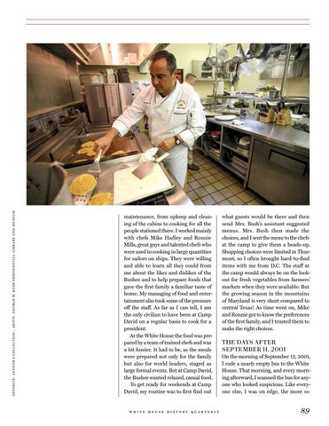 maintenance, from upkeep and cleaning of the cabins to cooking for all the people stationed there. I worked mainly with chefs Mike Hadley and Ronnie Mills, great guys and talented chefs who were used to cooking in large quantities for sailors on ships. They were willing and able to learn all they could from me about the likes and dislikes of the Bushes and to help prepare foods that gave the first family a familiar taste of home. My managing of food and entertainment also took some of the pressure off the staff. As far as I can tell, I am the only civilian to have been at Camp David on a regular basis to cook for a president. At the White House the food was prepared by a team of trained chefs and was a bit fussier. It had to be, as the meals were prepared not only for the family but also for world leaders, staged as large formal events. But at Camp David, the Bushes wanted relaxed, casual food. To get ready for weekends at Camp David, my routine was to first find out