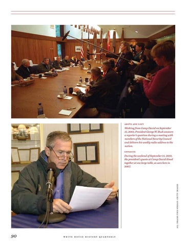Working from Camp David on September 15, 2001, President George W. Bush answers a reporter’s question during a meeting with members of the National Security Council and delivers his weekly radio address to the nation. opposite
