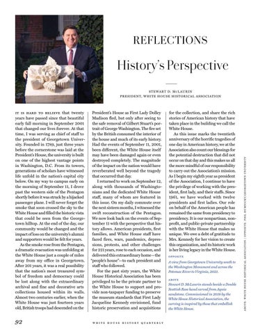 President’s House as First Lady Dolley Madison fled, but only after seeing to the safe removal of Gilbert Stuart’s portrait of George Washington. The fire set by the British consumed the interior of the house and much of its early history. Had the events of September 11, 2001, been different, the White House itself may have been damaged again or even destroyed completely. The magnitude of the impact on the nation would have reverberated well beyond the tragedy that occurred that day. I returned to work on September 12, along with thousands of Washingtonians and the dedicated White House staff, many of whom are featured in this issue. On my daily commute over the next sixteen months, I witnessed the swift reconstruction of the Pentagon. We now look back on the events of September 11 with the perspective that history allows. American presidents, first families, and White House staff have faced fires, wars, pandemics, depressions, protests, and other challenges for 221 years, rose to each occasion, and delivered this extraordinary home—the “people’s house”—to each president and staff who followed. For the past sixty years, the White House Historical Association has been privileged to be the private partner to the White House to support and provide non-taxpayer funding to preserve the museum standards that First Lady Jacqueline Kennedy envisioned, fund historic preservation and acquisitions