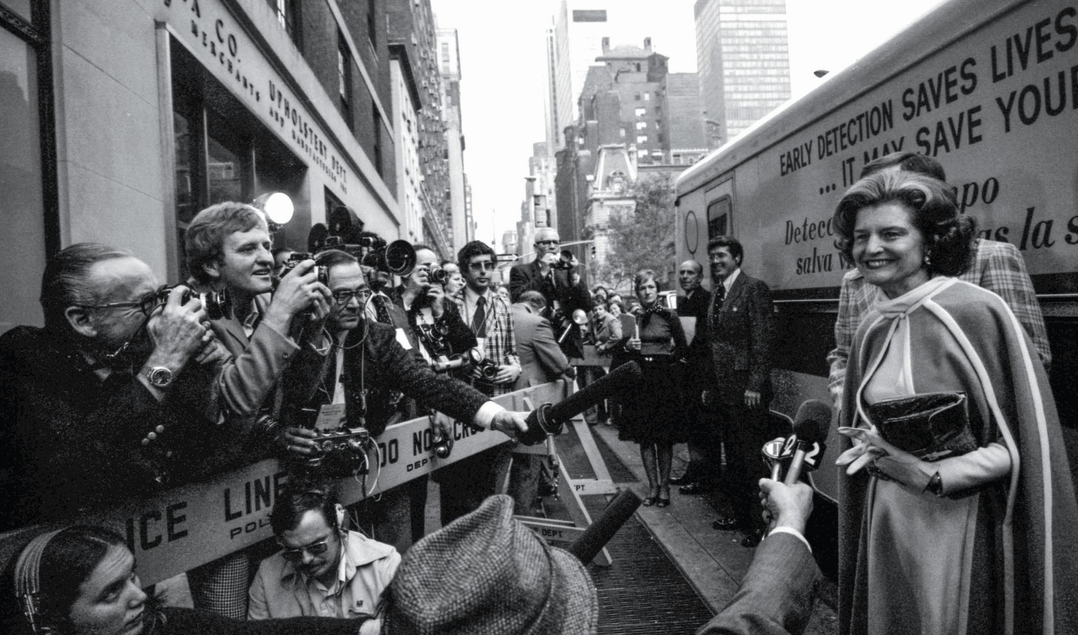 I said good-bye to Mom at the Bethesda Naval Hospital on the eve of her breast cancer surgery, September 27, 1974 (opposite). Mom broke with the customary silence about breast cancer and openly discussed her treatment with the public, advocating for early detection. The following year (above), she took questions from reporters when she arrived to tour the Guttman Institute for Early Detection of Breast Cancer in New York City.