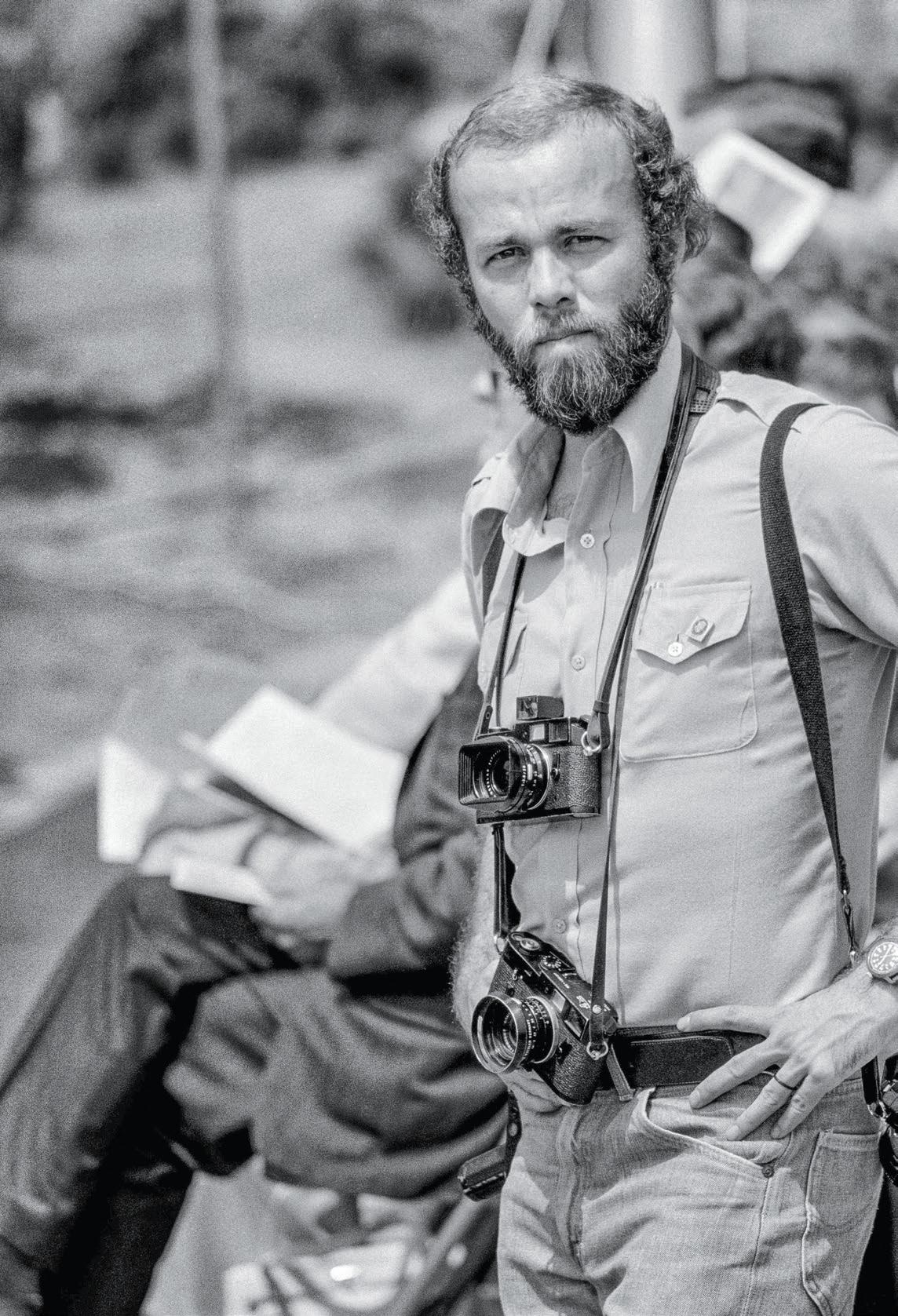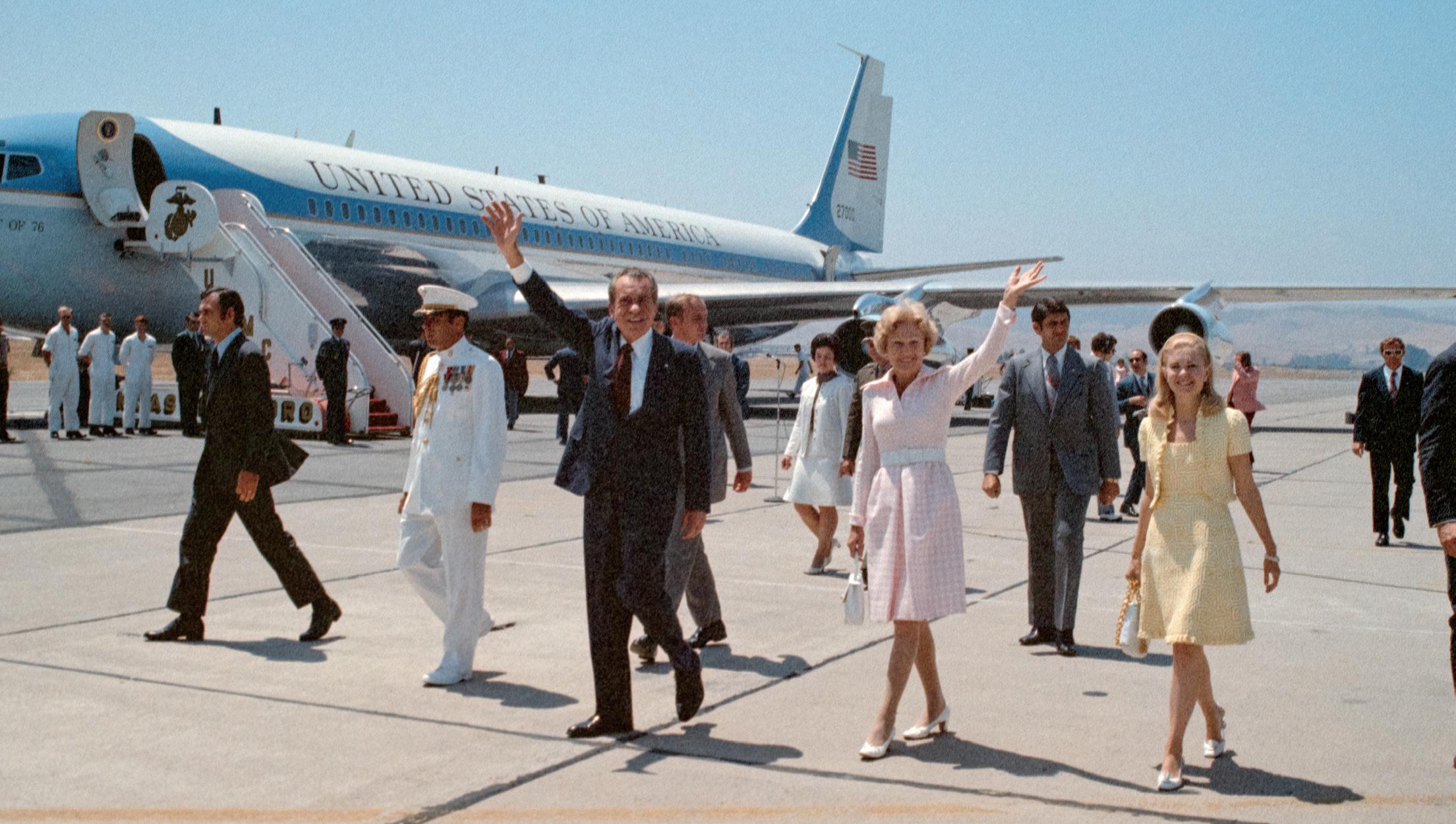 Carrying cameras and photography equipment, I descend the steps of Air Force One upon arriving in Philadelphia with Dad and my photography mentor, White House photographer David Hume Kennerly, May 18, 1975.
