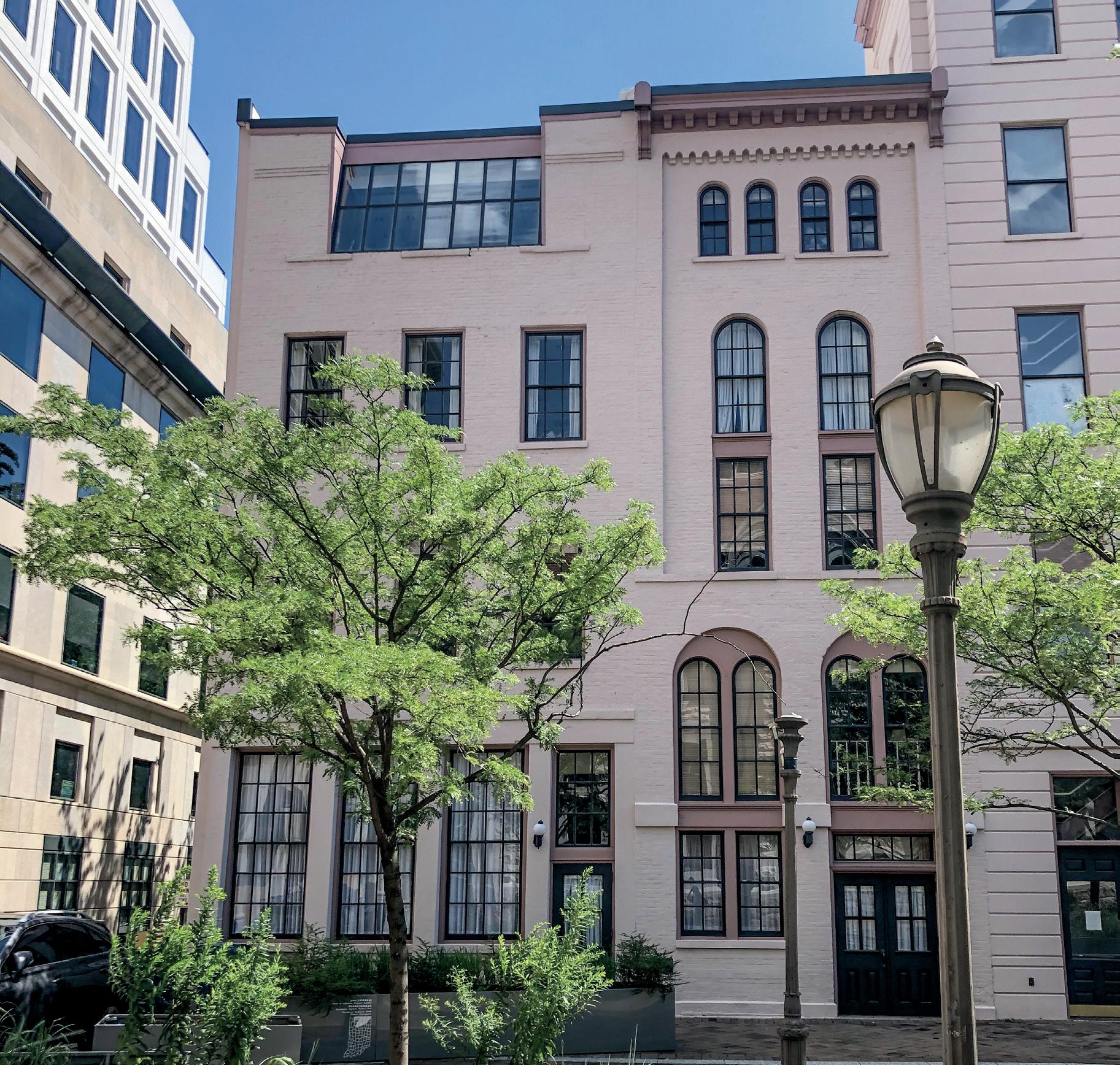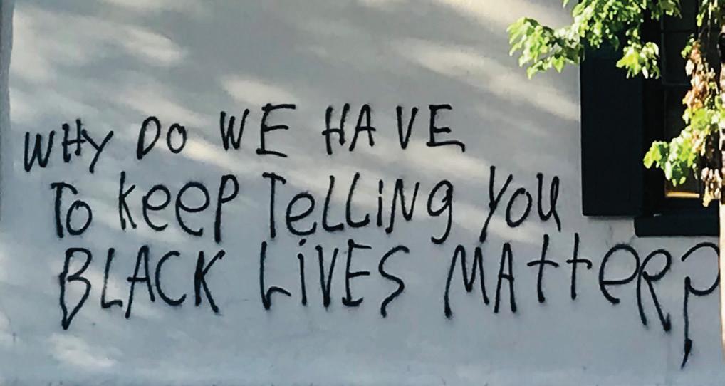 following the death of George Floyd. Although Lafayette Park has been the scene of regular protests since the suffragists began demonstrating there in 1917, this was the first time our building became a canvas for protest expression. One poignant phrase, captured in the photograph (below right), was central to the graffiti on the north side of Decatur House. Ironically, this wing includes the historic slave quarters. Part of our research for the past three years has focused on slavery in the President’s Neighborhood. The aerial image of the White House taken from the north (below) captures the President’s Neighborhood after the protests of earlier this summer.
