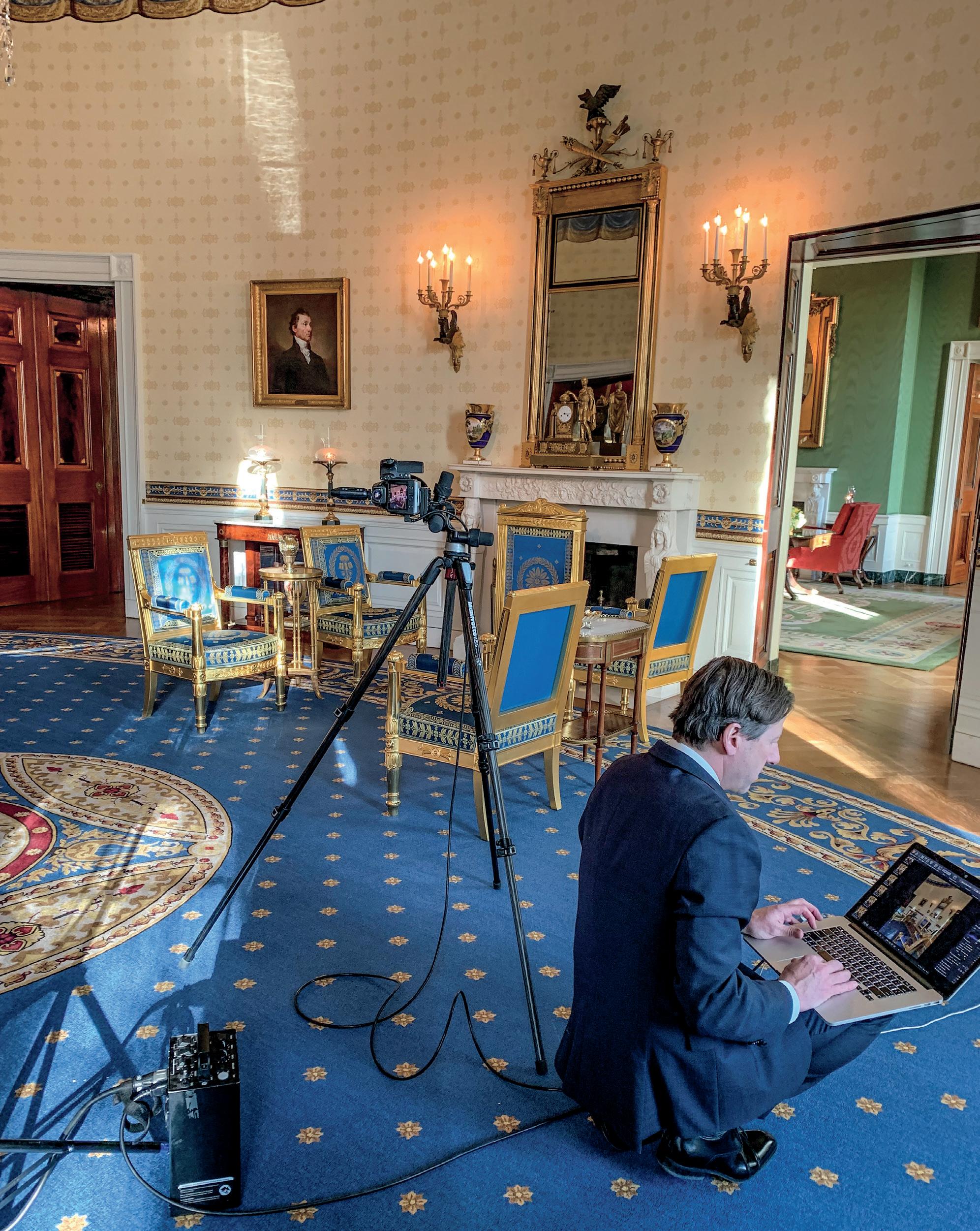 reviews his photographs on his laptop during a photo shoot to capture the newly refurbished Bellangé suite in the Blue Room for the cover of White House History Quarterly 56, which focused on the decorative arts collection, January 2020.