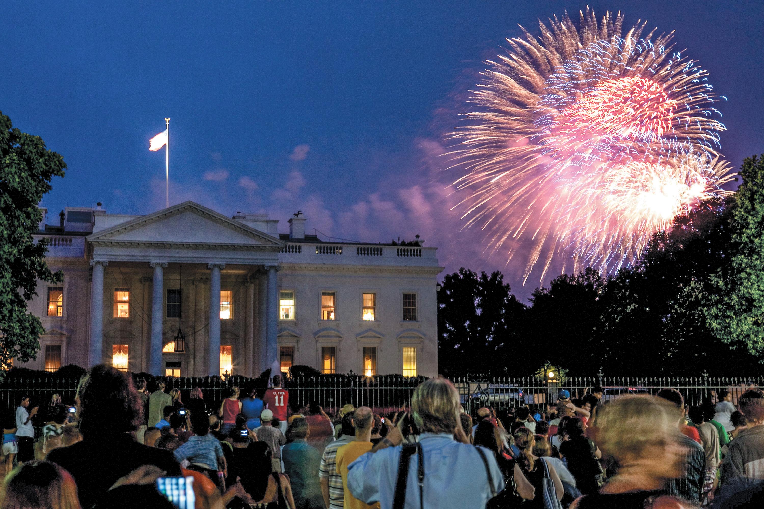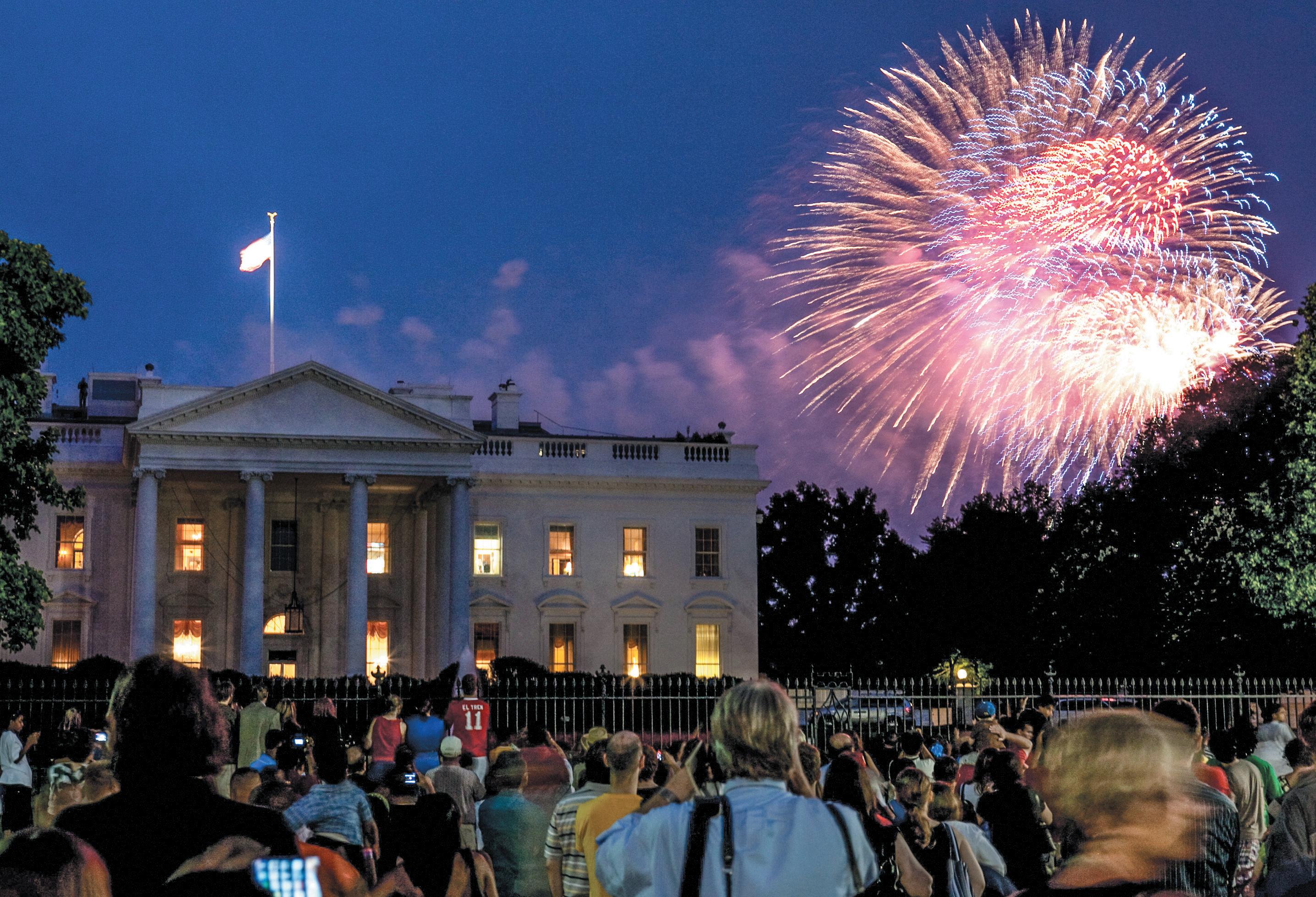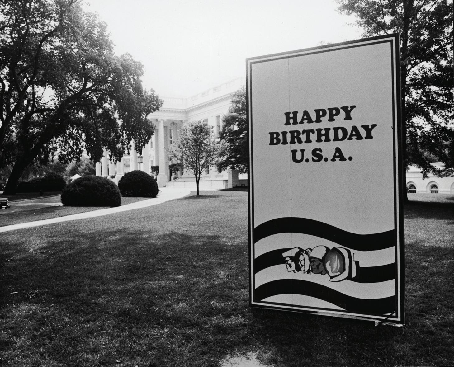 In 1976, a giant birthday card on the North Lawn (opposite) wished a “Happy Birthday” to the U.S.A., and in 2009 (above), the public was drawn to President’s Park to watch a fireworks display. Such observances of Independence Day have been celebrated at the White House for as long as it has been home to the presidents. President John Adams moved into the White House on November 1, 1800. The bicentennial of his arrival was celebrated in 2000 with a reenactment of the occasion (right).