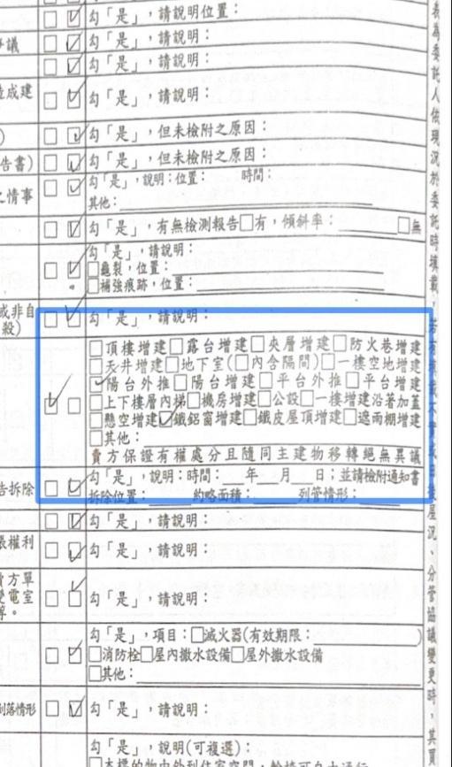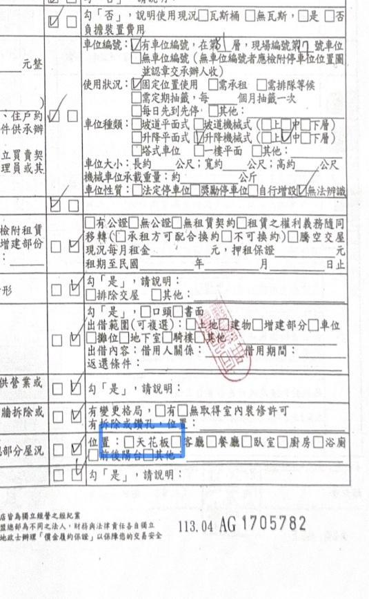 現況確認說明書查核 電線更新、漏水情形、增建部分、鋼筋外露、混凝土剝落、龜裂傾斜 02 牆面、樓板;垂直、水平檢測 牆面、樓板、窗框、門框、天花(木作) 03 預埋空調套管查核 室外機封閉、室內機套管、全熱交換器 04 暗架天花板及內部泥作檢測 暗架天花板內管道間泥作 05 防墜設施查核 欄杆、圍牆、窗台、樓梯扶手、窗戶安全鎖、防墜紗窗 06 車位尺寸覆核 小車位、標準車位、大車位、無障礙車位