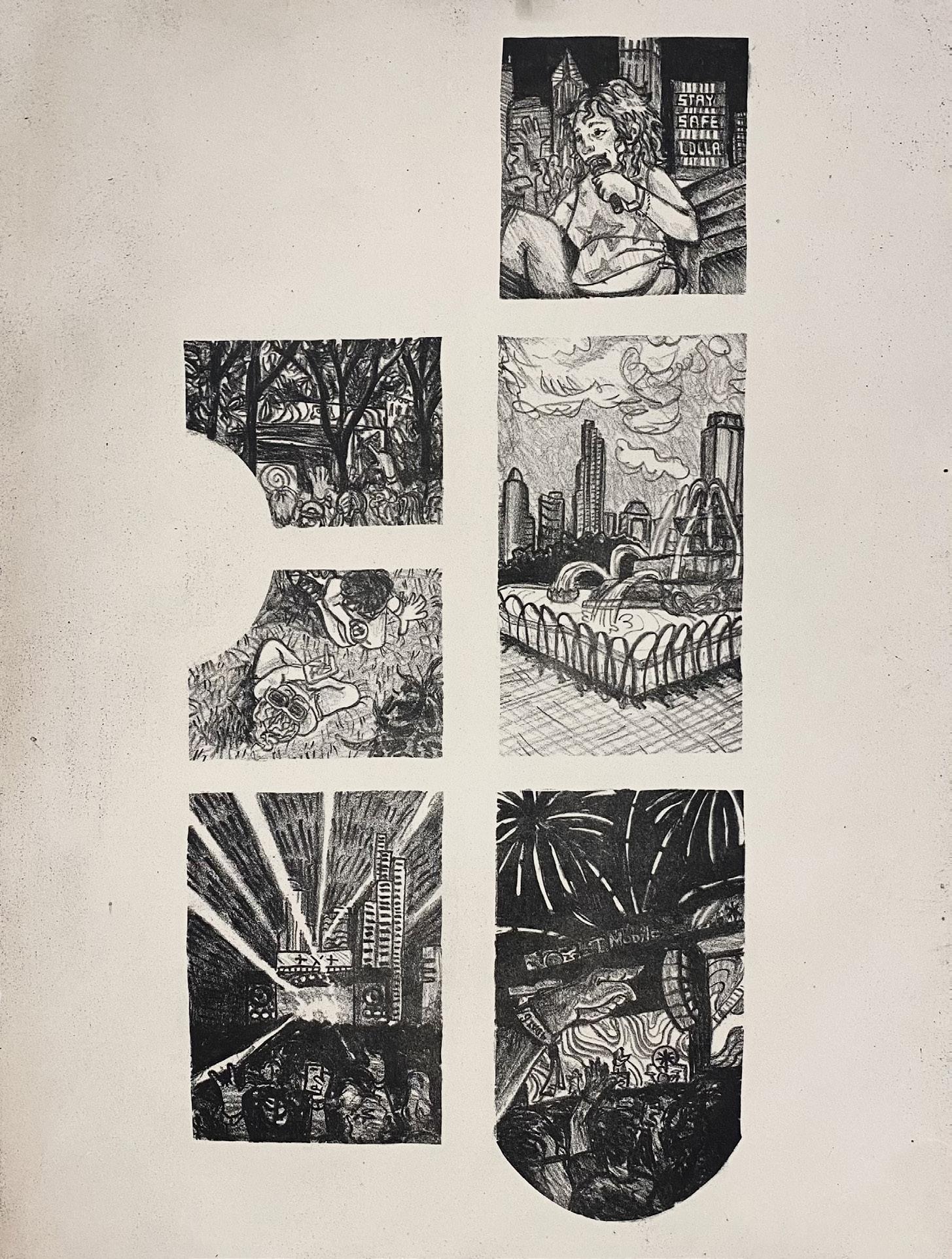 This is print is an illustrated map of Grant Park as experienced during the music festival Lollapalooza, celebrating both the music and the joy of human connection that occur there every year. Rah Catani, 2024, Screenprint