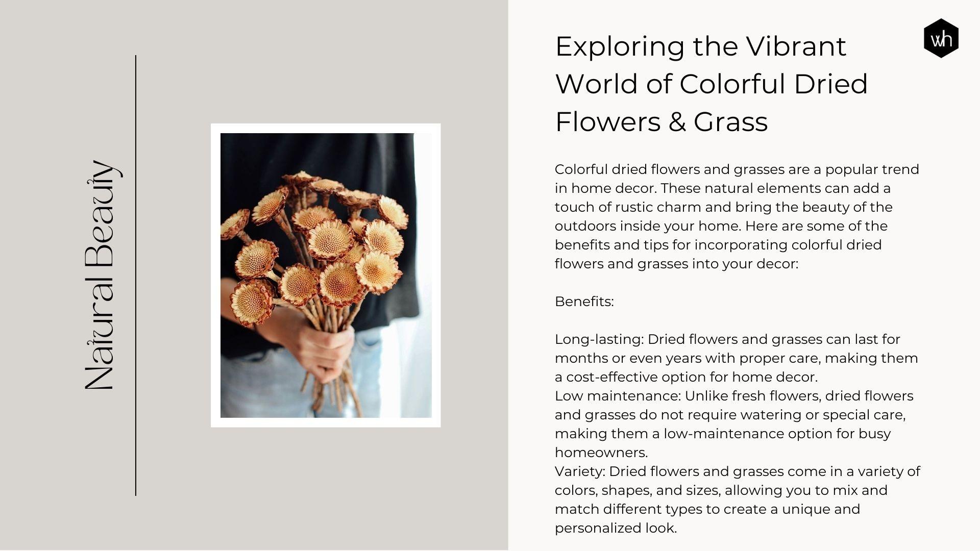 Whispering Homes offers a stunning collection of dried flowers for home decor and events. Our dried flower arrangements are made with care and attention to detail, bringing a touch of natural beauty to any space.