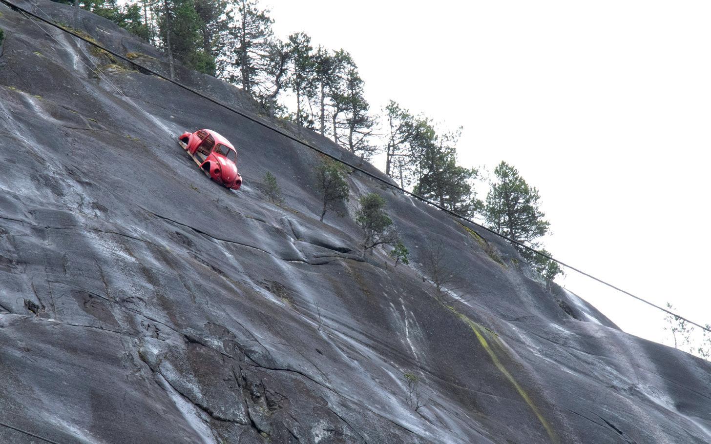 BC Parks is working to remove a hollowed-out red Volkswagen Beetle suspended from the rock face of The Papoose near Shannon Falls and says the operation will not be cheap or simple.