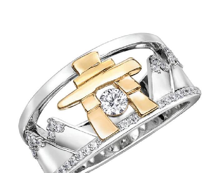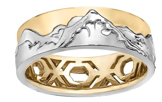 This Whistler Mountain scene band in 14k white and yellow Canadian gold showcases the local mountain range, with the detail completely circling the band. Available in most sizes by custom order. Unisex, designed by Keir. Available at Keir Fine Jewellery