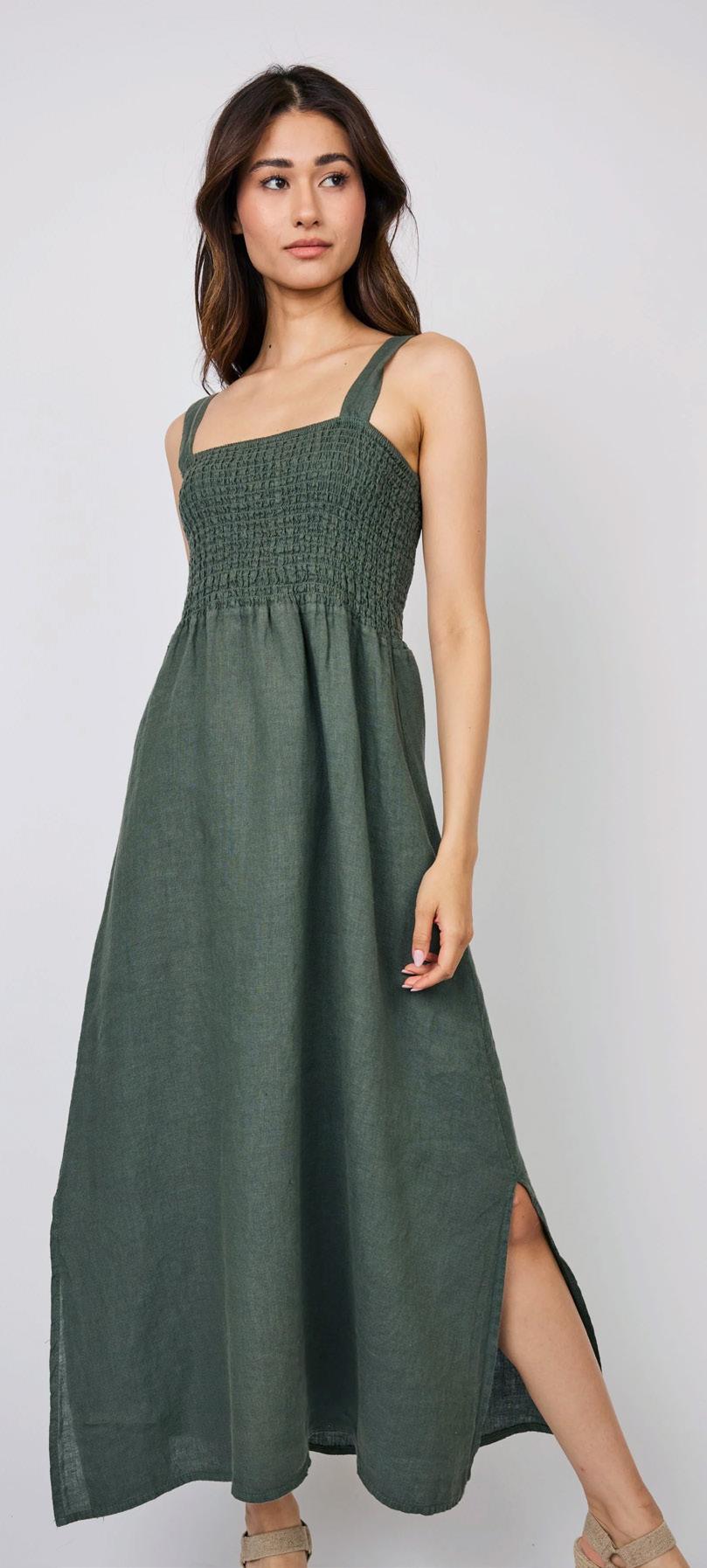 Make a statement this summer with this Pistache dress in safari colour. Made from 100 per cent premium quality linen, it is the ultimate combination of style and comfort. The bunched top design and fixed wide straps provide a secure and flattering fit, while the side slits add a touch of elegance to your outfit. The lightweight and breathable linen fabric will keep you cool and comfortable in the summer heat. Made in Italy. Available at Amos & Andes.