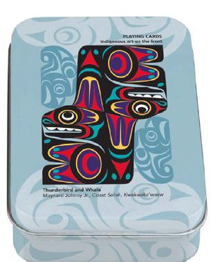 These Single Deck playing cards feature artwork by Coast Salish, Kwakwaka'wakw artist Maynard Johnny, Jr., and are packaged inside a tin box.