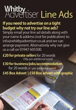 Ltd, PO Box 120, Whitby, North Yorkshire YO21 3ED. Company No: 05736318 | VAT No: 979 2029 82 All information in this magazine is published in good faith and cannot be reproduced without written permission. Artwork and copy is the responsibility of the advertiser. Whilst the publisher makes every effort to ensure that the businesses featured in this magazine are of the highest quality, we do not guarantee the services and products from any businesses featured. No liability will be accepted under any circumstances should any of the contents in this magazine be incorrect. Any complaints should be referred to Trading Standards, NYCC. The views expressed within the articles are not necessarily those of the publisher. All rights reserved. The paper used for the Whitby Advertiser is produced from guaranteed sustainable forests and carries the PEFC accreditation which is the European standard for tracking the timber from source to the final printed product. Further information can be found at www.pefc.org