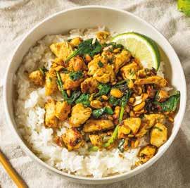 When all the chicken is cooked and caramelised, reduce the heat slightly and add the peanuts and garlic. Sauté for 3-5 minutes until the garlic is fragrant. Add the coriander, the remainder of the spring onions, and the pak choi. Squeeze lime juice into the pan and season with more salt and pepper as needed.