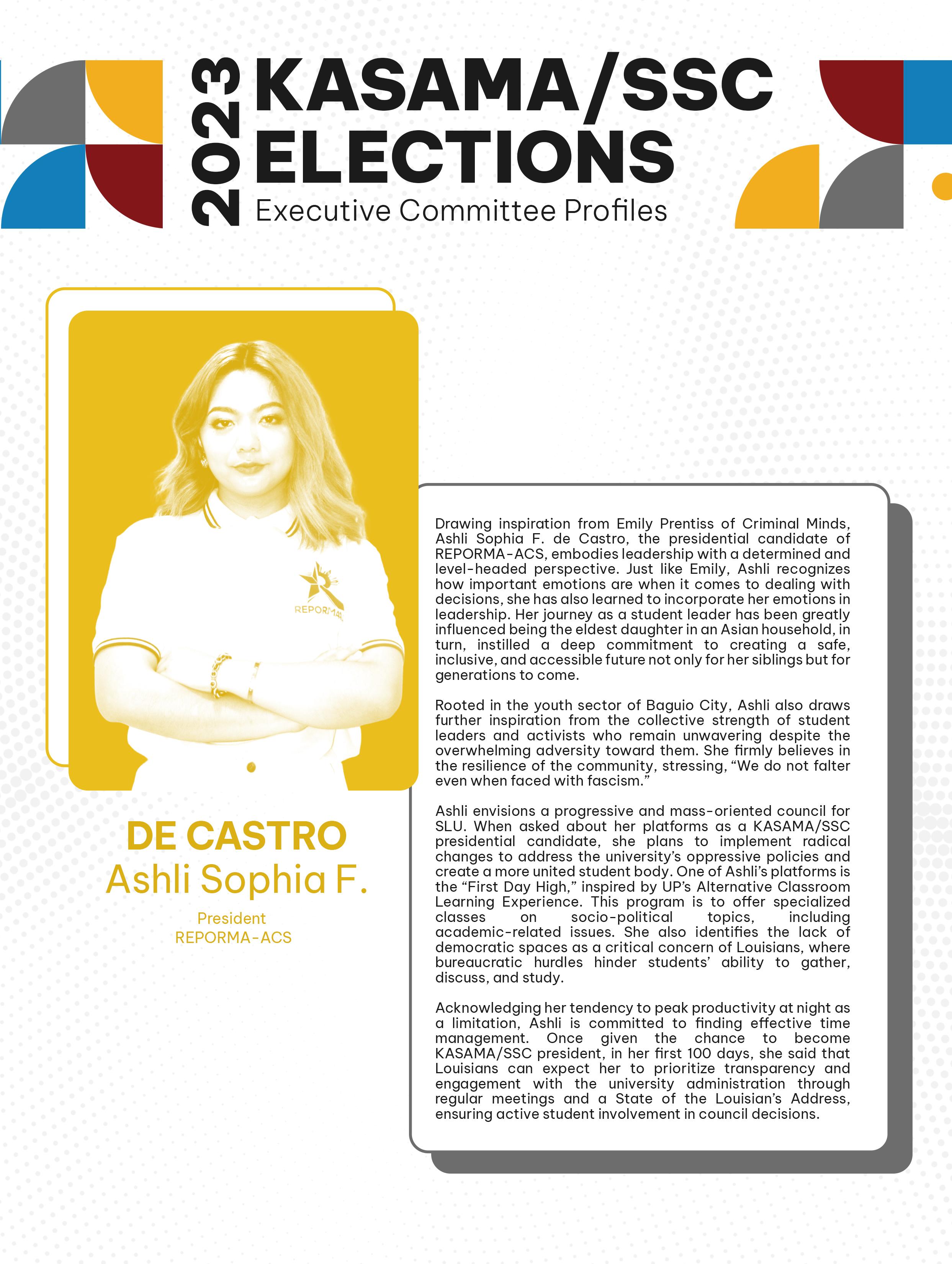 “Limitado ang pwede nating pagkumparahin gan’yan. Pero tinitignan namin siya talaga as something na alarming. Sa parte po ng Reporma-ACS, lalo’t lalo na ang ating executive committee na tumatakbo [ay] alarming siya, Kasi bakit kami lang? Pati kami napapatanong [na] bakit parang hindi na ba ganun ka-accessible si KASAMA/SSC,” expressed Ashli Sophia de Castro, Presidential aspirant, on the Executive Committee being unopposed.