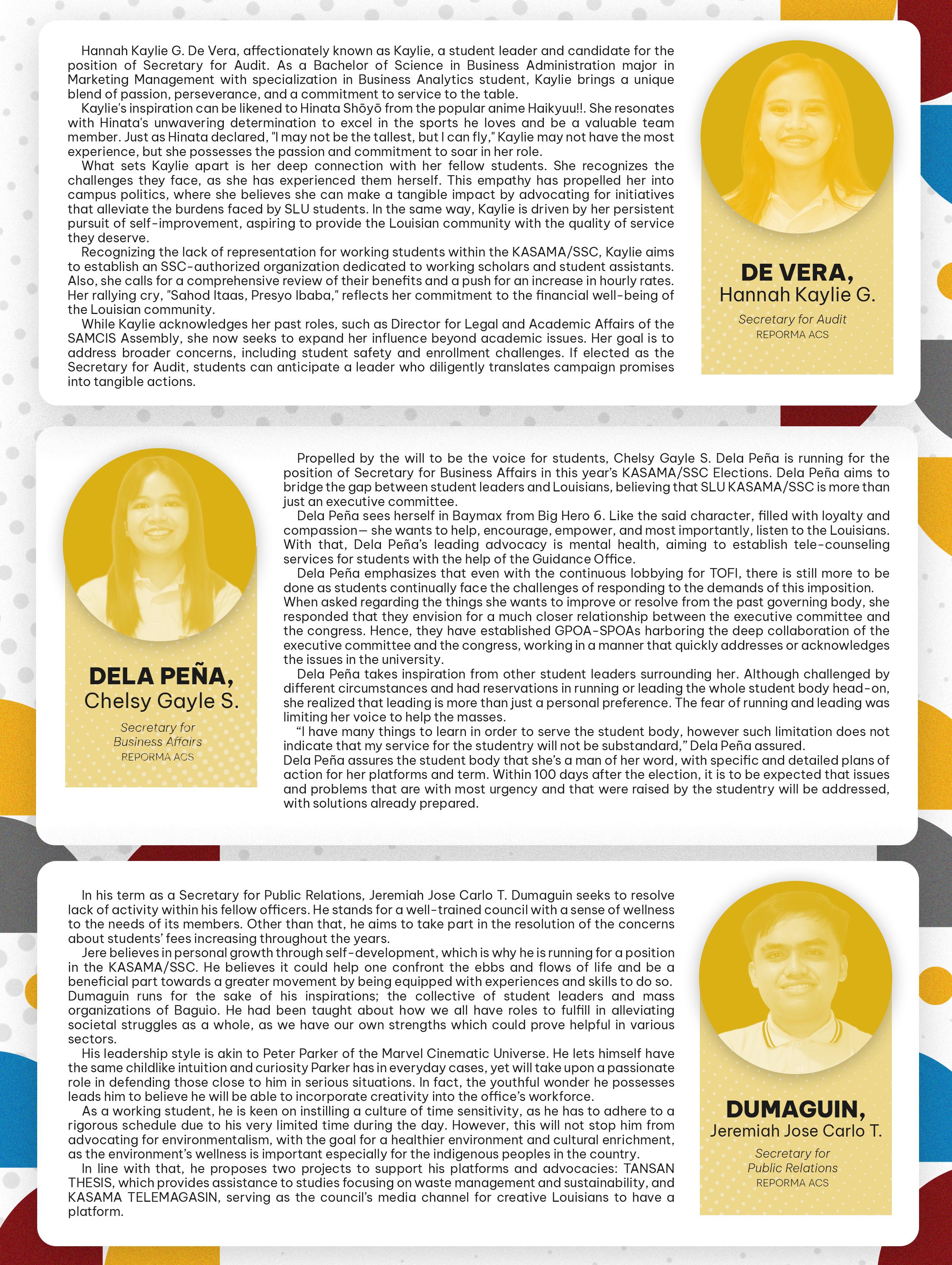 “It is still within the rights of the studentry to exercise their right to vote and determine whether they deem this slate as fit to run the student representation of SLU or not. Hence why this slate has crafted campaigns and platforms that cater to the individual struggles of the Louisians, that they may see why their vote matters when it comes to campus politics and, eventually, the politics of the Philippines,” Taylor added.