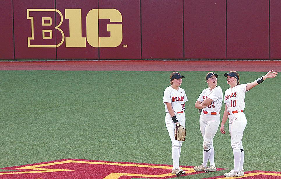 Outfielders Emma Larson, Maddy Belisle and Lauren Elias chatted between innings on the U of M logo.