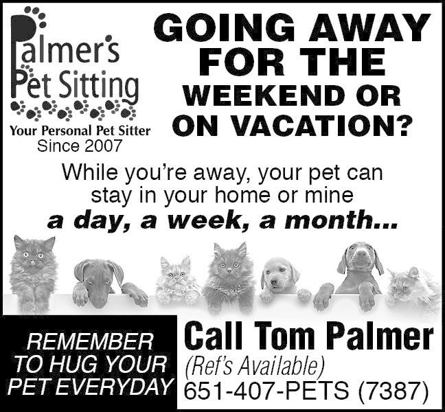OCTOBER 2023 THE LOWDOWN 15 www.presspubs.com WHITE BEAR PRESS | VADNAIS PRESS | QUAD COMMUNITY PRESS | SHOREVIEW PRESS | NORTH OAKS NEWS | THE CITIZEN | THE LOWDOWN EMAIL: callaspecialist@ presspubs.com PHONE: 651-407-1250 Honest Work for Honest Pay 651-270-7360 Reasonable Rates - all jokes and laughs are free Servicing All Major Appliance Brands Major Credit Cards Accepted APPLIANCE REPAIR EARTH WIZARDS earthwizards.co 763-784-3833 Asphalt Concrete Eco options Driveways, Sidewalks, Garage Floors, Aprons Family-operated for 3 generations Woman-owned, employee-centered PAVING for smart living ASPHALT 1 AUTO SERVICE • Auto Repair • Oil Lube & Filter Service 20 Years of experience serving White Bear Lake & Centerville - Friendly, Honest Service 651.226.4235 Monday - Friday 8 am - 6 pm 7137 20th Avenue North - Centerville www.facebook.com/vermauto 1 H UG E S AVING S! Lic. #20060261 651-257-4706 www.youngcastlebathrooms.com • Design • Bath Repair • Remodeling • Tub Surrounds • Free Estimates Bathrooms by BATHROOMS BLACK DIRT Screened Black Dirt Delivery Available 651.387.2098 Small Job Specialist 45 years experience 651.653.9920 / 612.816.8544 Basement Finish/Remodel Exterior & Interior Painting Doors/Windows/Siding Ceiling Textures/Roofs Kitchen Remodels/Counter Tops Decks/Landscaping Odd Jobs Bathrooms CARPENTRY 1 CARPENTRY Schneider Custom Woodworks Custom CABINETRY! Free Estimates & Callbacks within 24 hours schneidercustomwoodwork.com 651-213-6638 Commercial & Residential CUSTOM WOOD WOR KS CHIMNEY/FIREPLACE Chimney Inspections/Sweeps Chimney Repair/Rebuilds Tuckpointing Stainless Steel Liner Installations • Gas Fireplace Services • Fireplace Installations Masonry, Chimney & Fireplace 651-565-9916 1 CLEANING Household Waste Construction Debris Appliances Furniture FULLY INSURED • FREE ESTIMATES 651-308-1101 BillLe e • Specialist in Driveways/ Garage Slabs • Sidewalks/Steps Repair & Replacement Block Repair Interior/Exterior Residential/Commercial CONCRETE 1 Sidewalks Patios Steps Driveways & More! MJ’s Concrete, LLC 651.795.9736 CONCRETE Settled Concrete? Lakes Area Mudjacking - Since 1983Don’ t replace it, RAISE it and save $$$! Walks • Patios • Steps • Garage Floors Aprons • Driveways • Fill Voids Free Estimates Guaranteed 612-310-1485 Ask for Jim l a ke s a re a mudj a c k in g . co m 1 1 DECKS Be ready to enjoy your deck this spring! Let us build your deck now We build decks all winter long! CALL US FOR SPECIALS! 651-746-4582 northlandlandscape.com Bonded Insured | Lic #BC638094 LORENZ DRYWALL • CHANGING CEILINGS OVER TO KNOCK DOWNS • TAPING • SPRAYING • ADDITIONS • BASEMENTS • NEW HOMES • GARAGES No job too small! Kerry 651-653-9021 (Cell) 651-271-4221 DRYWALL Wolf Bros. Dr ywall Co. Total Dr ywall Ser vices Residential/Commercial New Const & Basement Finishes Family Owned & Operated Forest Lake Insured CALL LEE (651) 428-0229 40 yrs • Since 1979 DRYWALL/PLASTER ELECTRIC New Construction/Remodel Residential Commercial Competitive Rates ELECTRICAL SERVICES 651-307-6502 HANDYMAN Ron Skibsted, R.S. Construction 651-271-5000 FREE Estimates! Specializing in • Handyman • Remodeling • Drywall Repair• Bathrooms • Kitchens License #BC002674 Licensed Bonded Insured 1 1 1 Furnace & A/C Installations and Service Licensed, Bonded & Insured 651.426.4233 cphvac.net HEATING & COOLING EVERY DAY Pawesome ! Pawesome ! MA KE EVERY DAY Pawesome ! Pawesome ! PET SERVICE DIRECTORY Fancy Pawz Nail trims and bathing services by appointment! Robin Udstuen | owner 15190 Everton Av. North, Hugo, Mn. 55038 651-485-9774 tcdistributing@msn.com Free Pupcake with Every Appointment. Let’s Talk Herbs Did you know that dogs can take natural herbs and vitamins and it might be beneficial for them. Herbs and Vitamins could help your dogs live a healthier and happier life. You can learn more on my website: HolisticHerbsForDogs.com - where you can watch my Podcast. Canine Holistic Health and Therapy Diploma Tami Lytle KATIE’S K9 Obedience School Puppy Classes Private Lessons Beginner I Phone Consults Radio Show KTK9.COM 651- 429-5433 612-807-7850 www.mjthecrittersitter.com MJ The Critter Sitter Professional Pet Sitting & Dog Walking Services Owned & Operated by a Veterinary Technician with 20 years experience in animal care - Insured & Bonded - Veterinarian Recommended -References available We’ve been keeping pets happy and comfortable at home since 2009 Personal Touch Pet Grooming “When Quality and Service Matter” 763 784-4833 TDD 784-0662 Dial 711 for Relay Assistance Deb Molin Certified Master Groomer 200 Marian Ct., Circle Pines, MN 55014 Since 1989 BACK TO SCHOOL 100% dedicated to your pet’s grooming in a cozy, intimate pet spa, not a big box store! Check out our social media to see all of our happy clients! 143 North Lake Street, Forest Lake www.petstylesmn.com 651-464-6996 Nail Trims by appointment only. 782606 2015-2020 2017-2023 petstylesgrooming petstylesgrooming PETSTYLES Grooming Salon Forresst Laake s Or giina Groom ng g Sa on since e 1989 Tues-Sat Day & Eve Appts. Caal o onne e of o our r C Cert t fied Maaster Groomers a at t FALL IN LOVE WITH OUR STYLES BACK TO SCHOOL 100% dedicated to your pet’s grooming in a cozy, intimate pet spa, not a big box store! Check out our social media to see all of our happy clients! 143 North Lake Street, Forest Lake www.petstylesmn.com 651-464-6996 Nail Trims by appointment only. 782606 2015-2020 2017-2023 | petstylesgrooming petstylesgrooming PETSTYLES Grooming Salon Forest Lake s Or g na Groom ng Sa on s nce 1989 Tues-Sat Day & Eve Appts. Ca a one e o of ouur r Ceerrt f e ed d Maasster G Groooommerrs at t